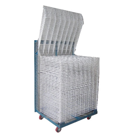 千层架,又叫丝印千层架、乾燥架、千层车、晾晒架、晾纸架、网架、层架台车。适用于印刷、上胶、喷漆、上色,溅镀後的晾乾置放器材。活动式多层网格设计,置放空间大,操作方便,节省车间、库房面积,并可适用於所放产品的常温晾乾和进焗炉高温烘烤。